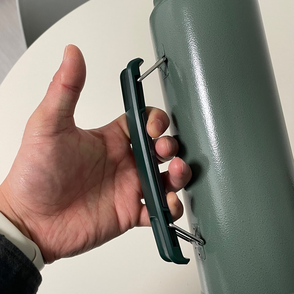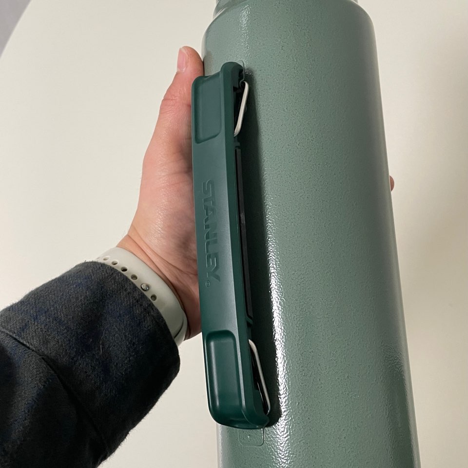 크기가 큰만큼 휴대하기 편하도록 손잡이가 달려있습니다. 2번째 사진처럼 튼튼하게 텀블러와 연결된 철고리와 손잡이 부분을 확인하실 수 있습니다. 마치 원통형 가방을 휴대하는 느낌이 듭니다.