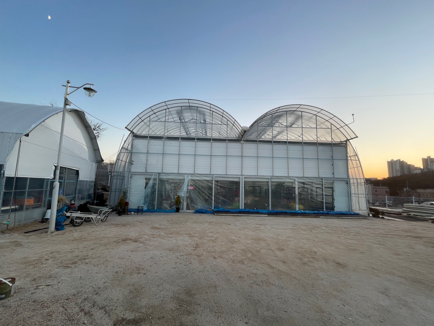 화인 꽃 농원의 큰 비닐하우스가 하나 보입니다.