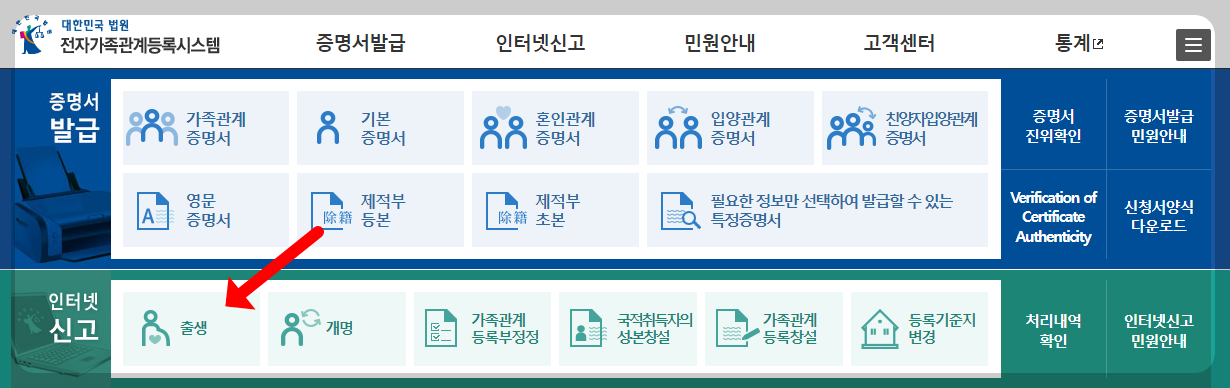 1. 다음 날 대한민국 법원 전자가족관계 등록시스템에 접속합니다. 그리고 상단의 인터넷 신고란의 '출생'란에 들어갑니다.