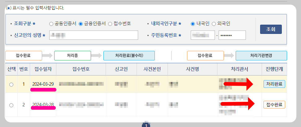 그러면 이제 막 온라인 출생신고를 마치신 분들은 2번의 접수완료만 보이실겁니다.