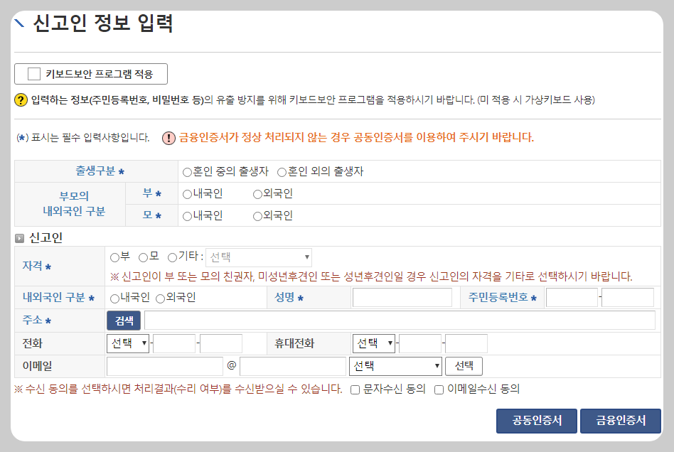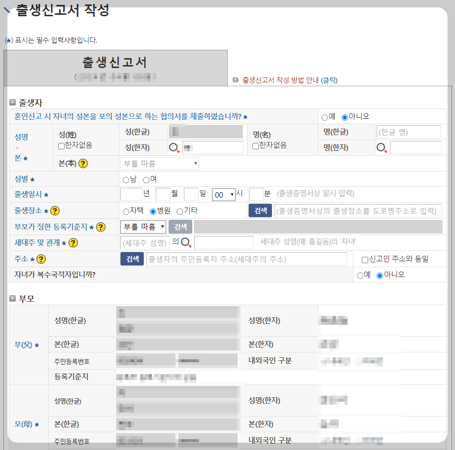 5. 신고인(출생아의 부모)의 기본 정보를 입력합니다.