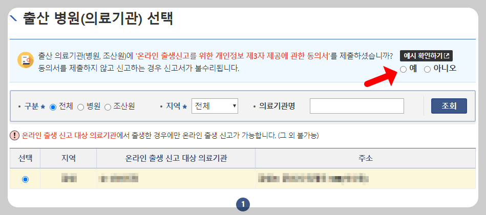 3. 검색, 선택 후 온라인 출생 신고를 위한 개인정보 제3자 제공 동의서 제출 확인에서 '예'를 선택한 뒤에 다음 단계로 넘어갑니다.
