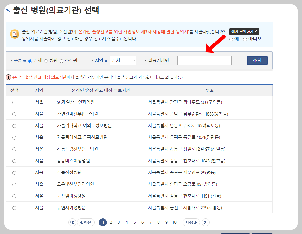 2. 온라인 출생 정보 동의서를 작성한 산부인과를 검색, 선택해줍니다.