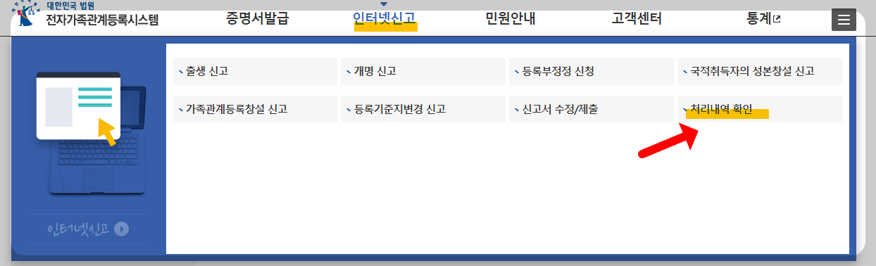 방금까지 온라인 출생신고를 작성하셨던 전자가족관계 등록 시스템 사이트에서 상단 '인터넷 신고'란에서 '처리내역 확인'에 들어갑니다.
