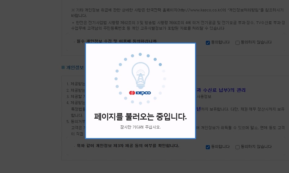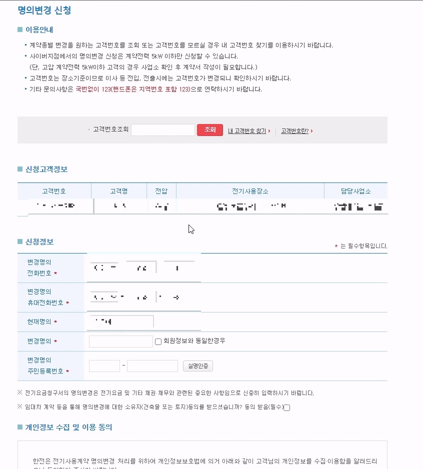 - 넘어간 화면에서 전 전기 사용자의 명의에서 본인의 명의로 변경하기 위한 간단한 개인정보들을 입력해주시구요. 신청서 하단에 개인정보 동의를 하고 신청합니다.