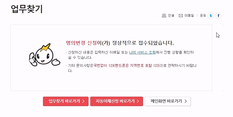 - 로딩화면 후 전기 사용자 명의 변경신청이 접수되었다는 문구가 나옵니다. 바로 확인해보니 저의 경우는 바로 변경이 된 것이 확인되었습니다.