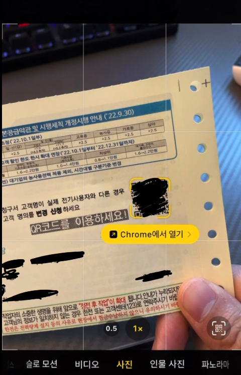 스마트폰 카메라로 전기 요금 수납 통지서에 기재된 QR코드로 화면을 옮기면, 화면 상에 QR코드 링크가 뜹니다.